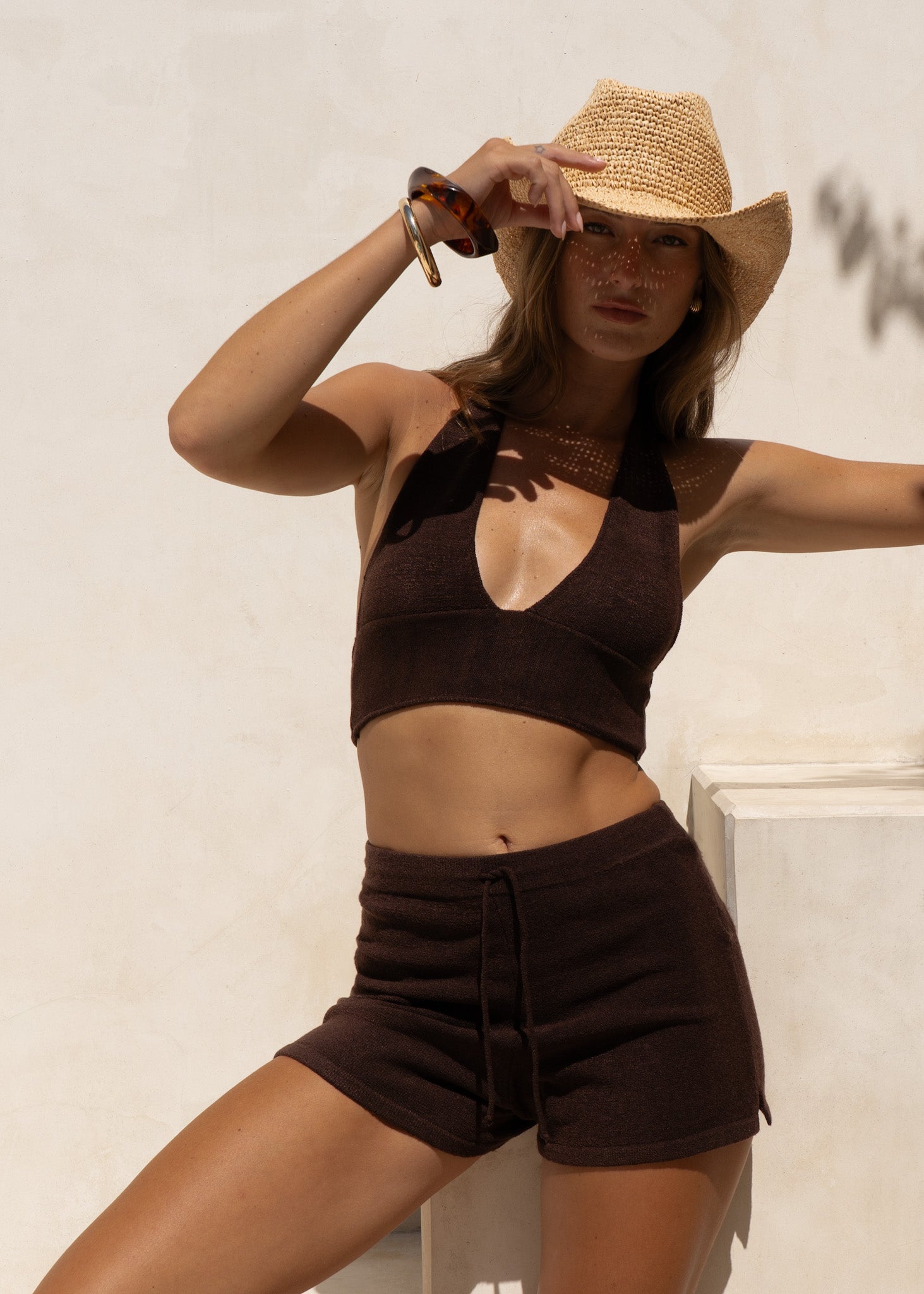 A modern take on retro leisure. Crafted from a soft stretch viscose/ spandex knit blend that moves with you, the Remy knit short offers a flattering high-rise fit and a comfortable silhouette in a rich chocolate brown colour. Featuring a wide waistband for gentle support, it’s the short you’ll reach for on sunny days, slow mornings, and everything in between.