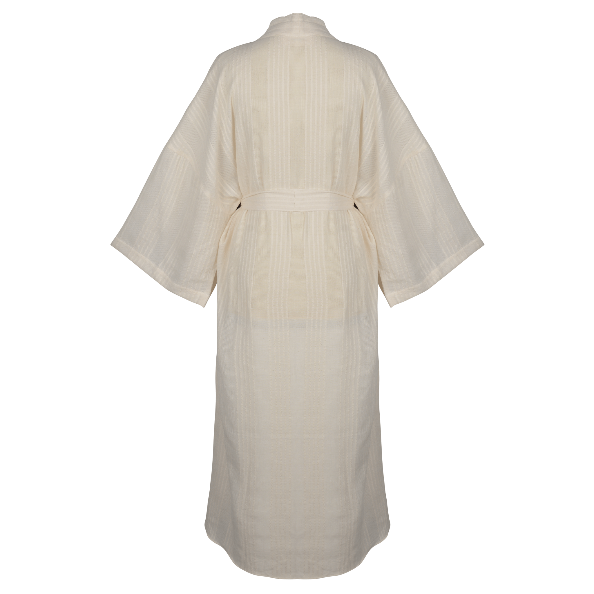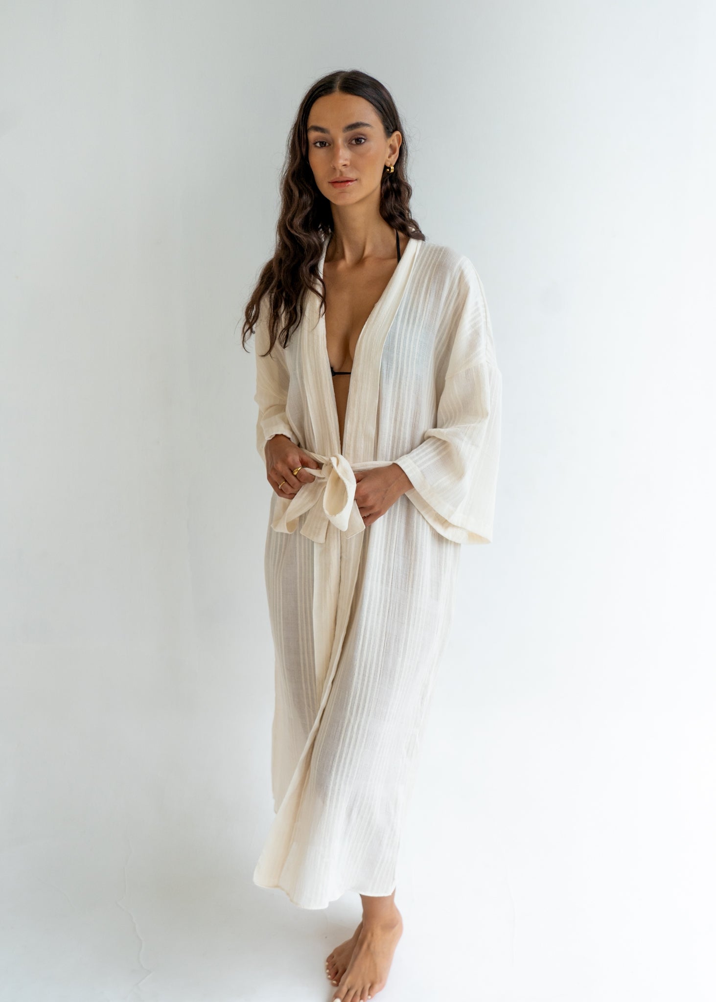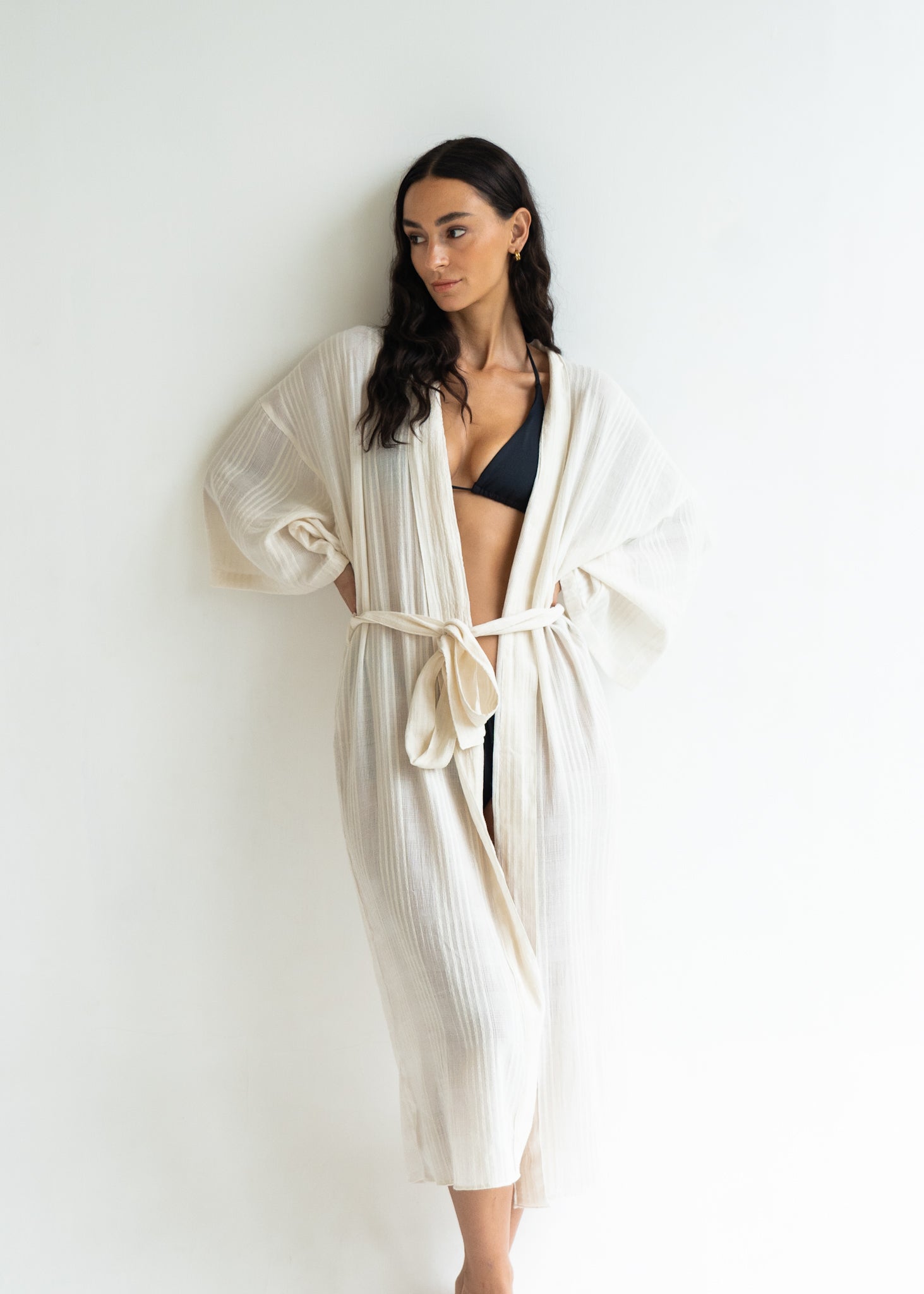 Designed with your comfort in mind, whether you're at home or on holiday, our Halcyon Days long robe effortlessly elevates your lounging experience. This versatile piece seamlessly combines elegance and coziness, becoming an indispensable addition to your wardrobe. Whether you're winding down for the day or savouring a leisurely beach stroll, the Halcyon Days robe effortlessly merges style and functionality, making it the ultimate choice for leisure and tranquility.