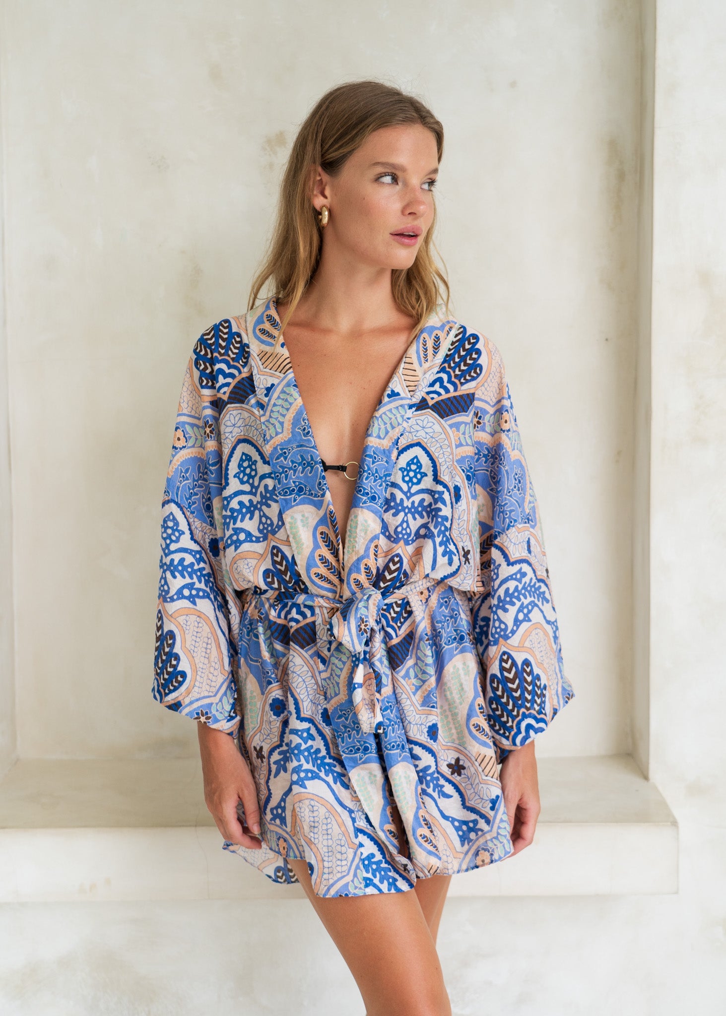 Block printed by hand in Indonesia, our ocean print Muse Robe is a versatile cover-up kimono style piece created with the ultimate leisure state in mind. Designed to be the centrepiece of your ensemble, this tie-style robe is made from a delicate, ultra lightweight fabric featuring a plunging neckline that effortlessly transitions from day to night. Wear loosely for a relaxed vibe or cinch at the waist with a belt for a more tailored look. Pair with sandals during the day or boots in the evening, the Muse will rise to the occasion.