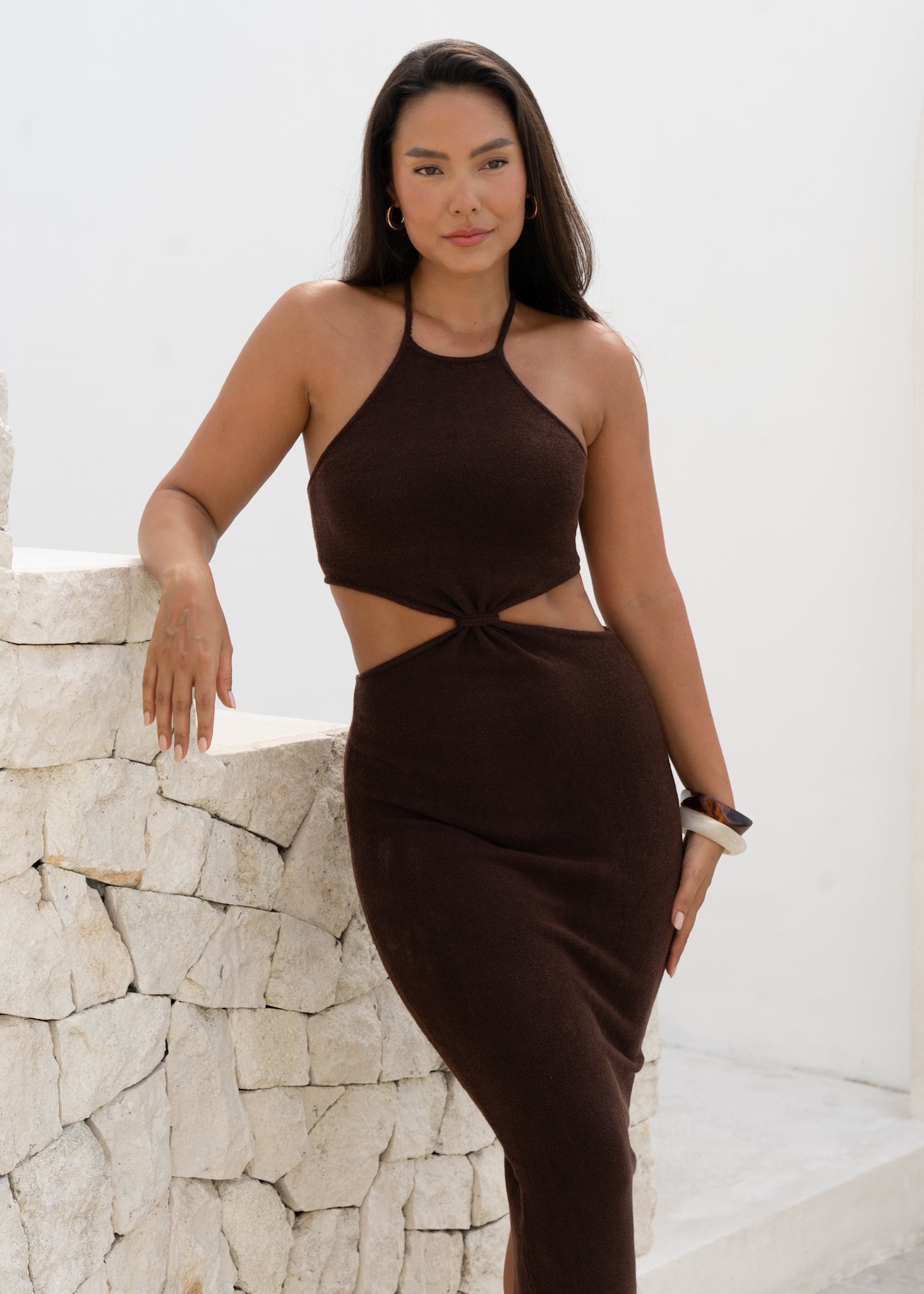 The Soho Halter Neck Knit Dress is perfect for any event or evening out. Understated yet bold, it features a cutout design through the waist with a centered knot that creates flattering shape for the body. The midi-length style adds sophistication, while the bodycon stretch knit ensures a sleek fit. This dress is the perfect balance of unique and modern, making it a standout choice for when you want to look as good as you feel, especially in this season's hottest shade of brown, Espresso.